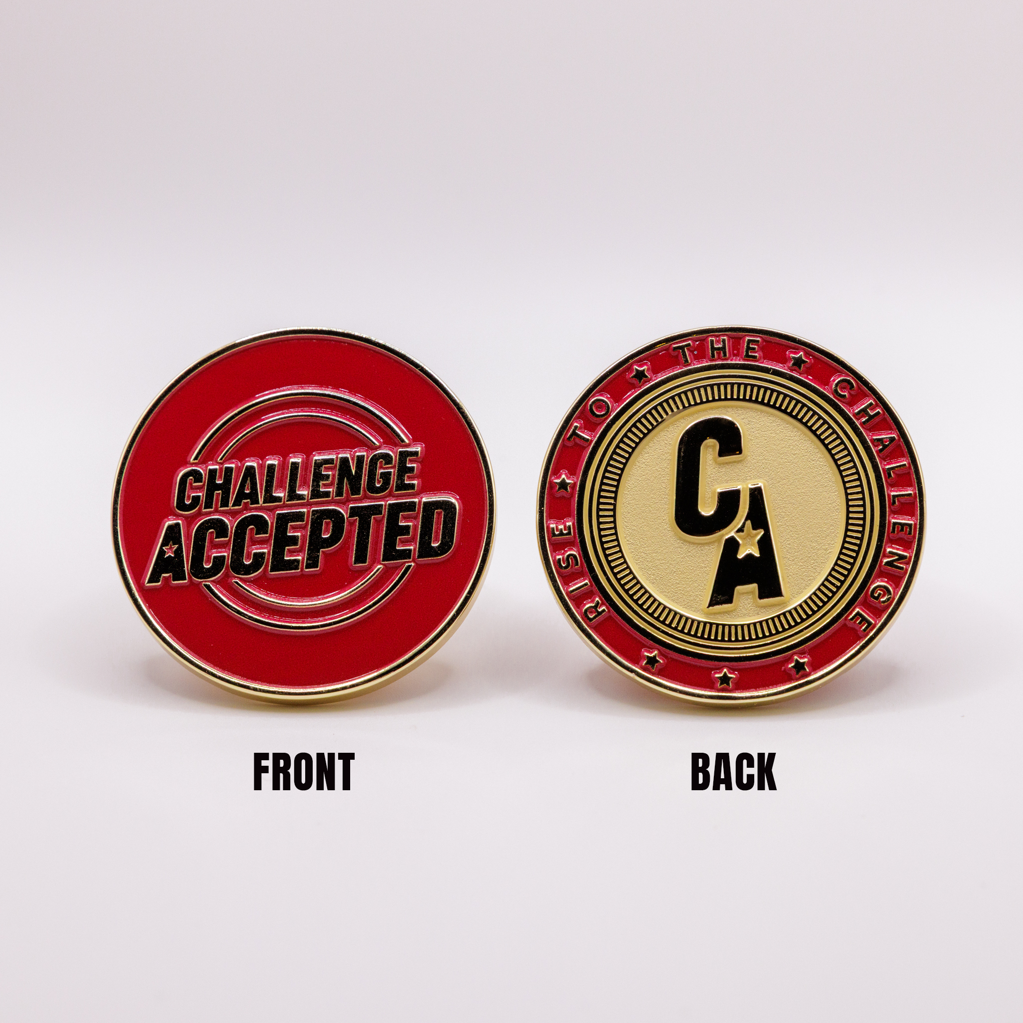 Limited edition Challenge Coin. Only 100 of these coins have been minted! This premium collectible features the Challenge Accepted logo on the front and the phrase “Rise to the Challenge” on the back.