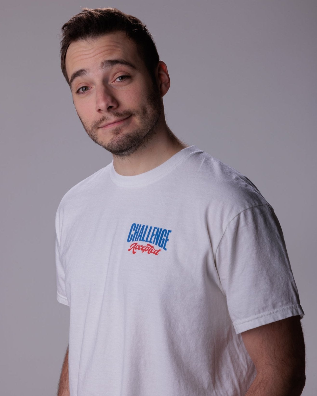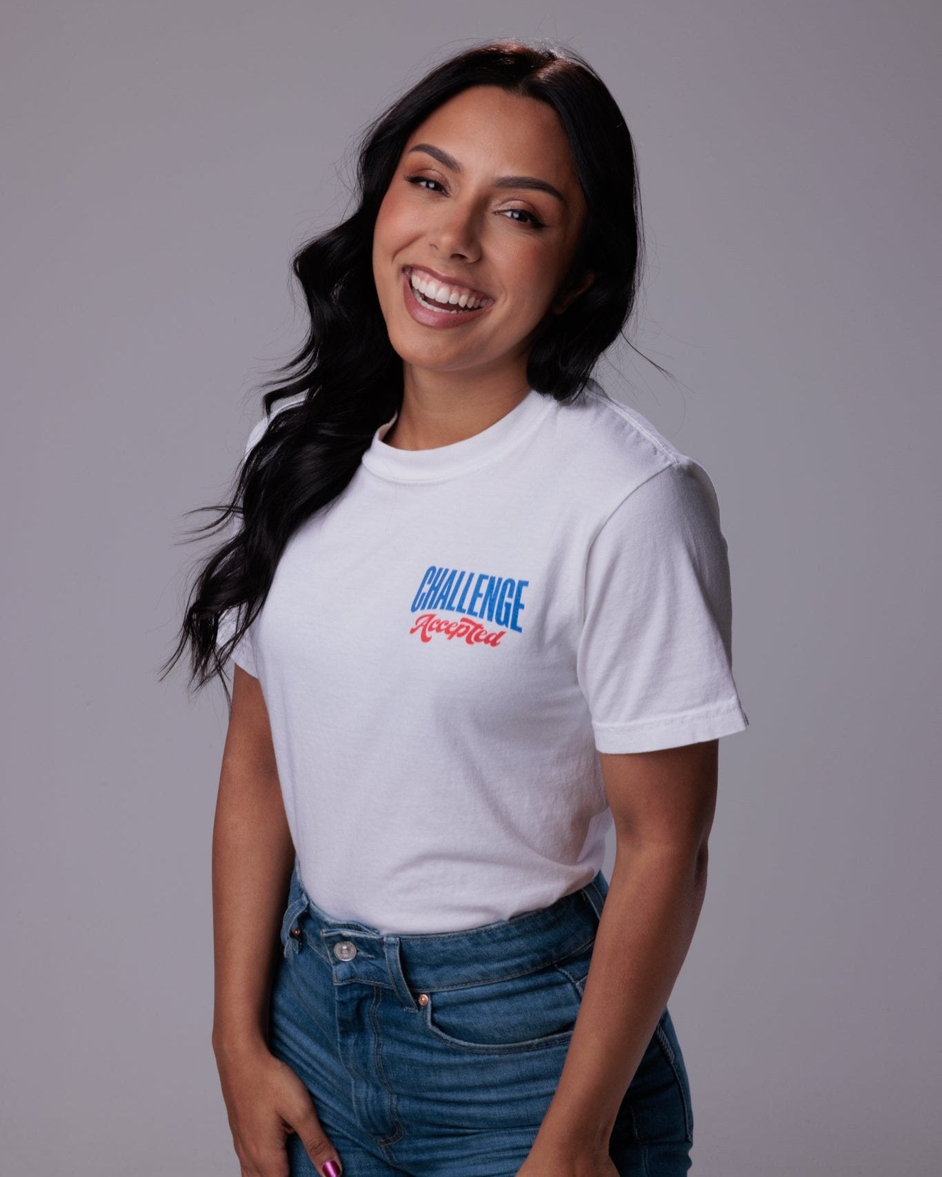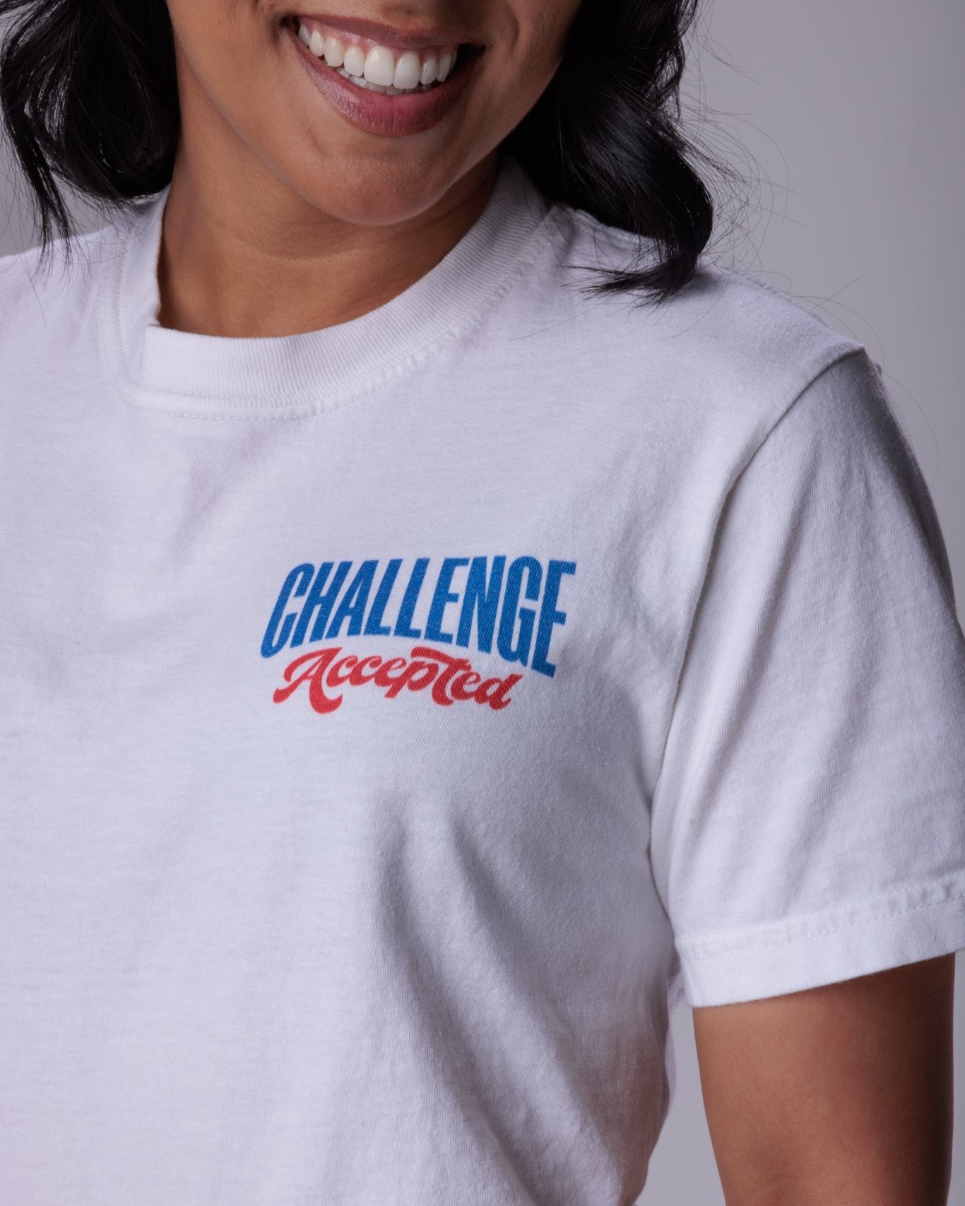 Our classic white tee featuring the full color Challenge Accepted design. This is a unisex, garment-dyed heavyweight structured tee that’s also super soft and breathable. 100% ring-spun cotton.