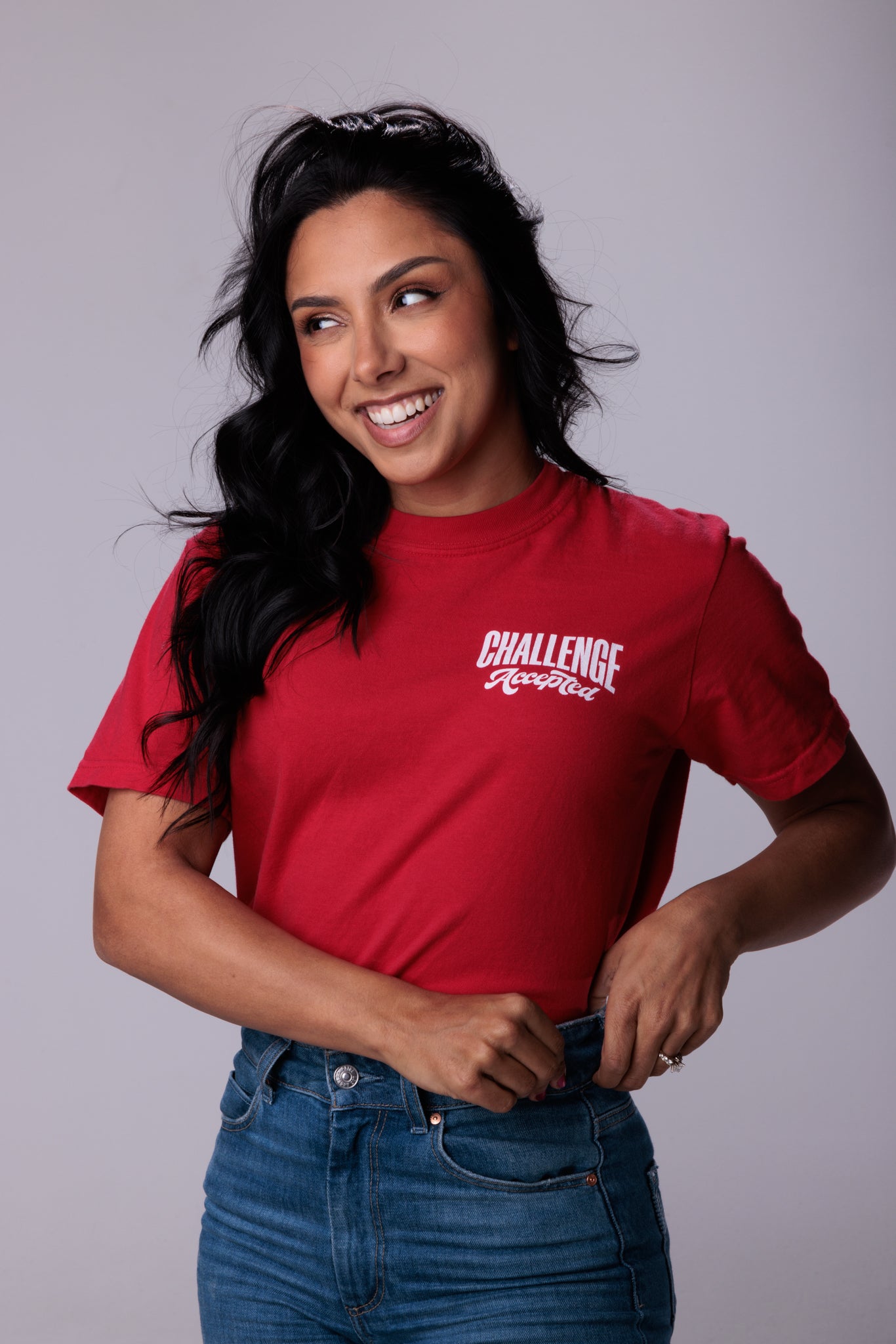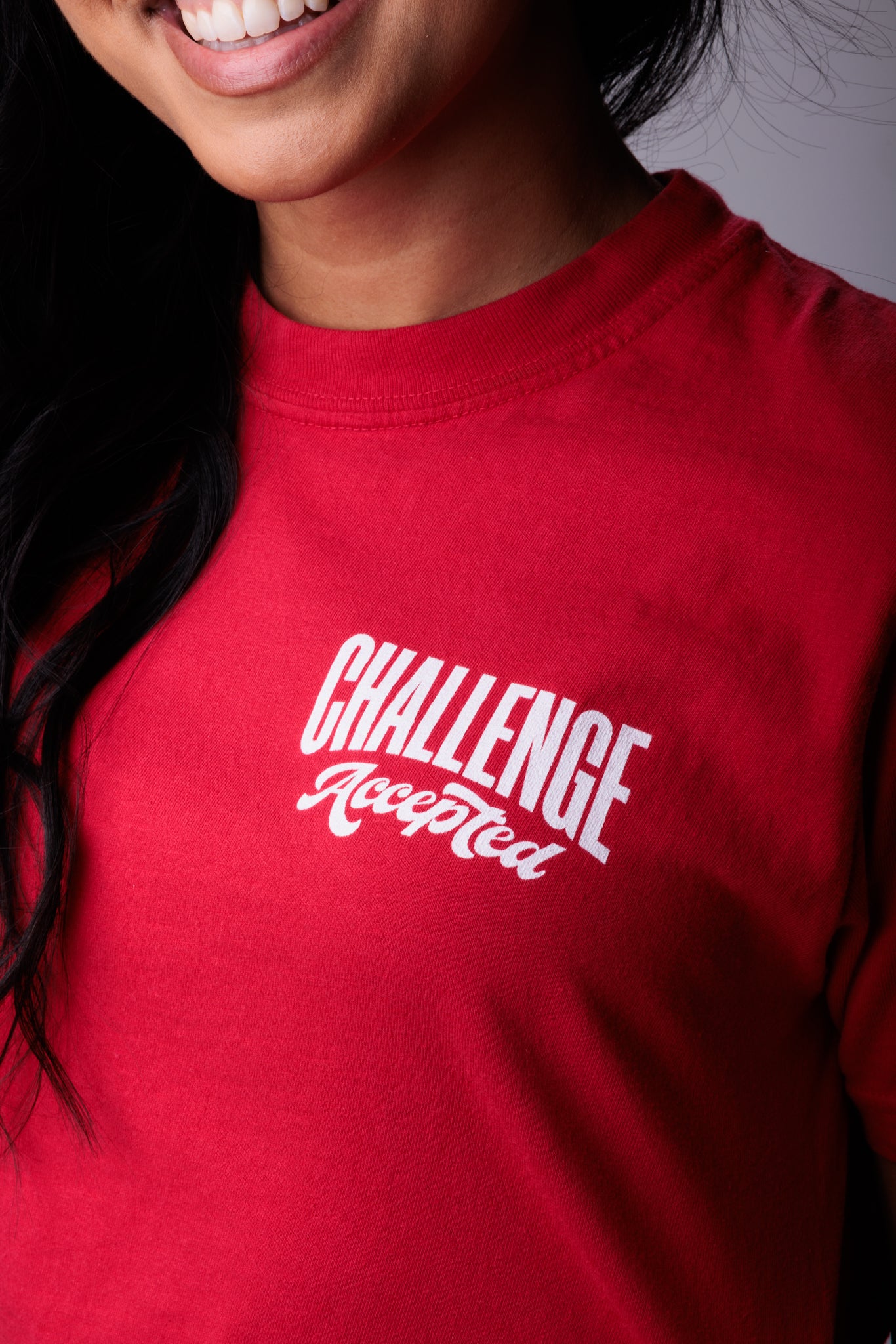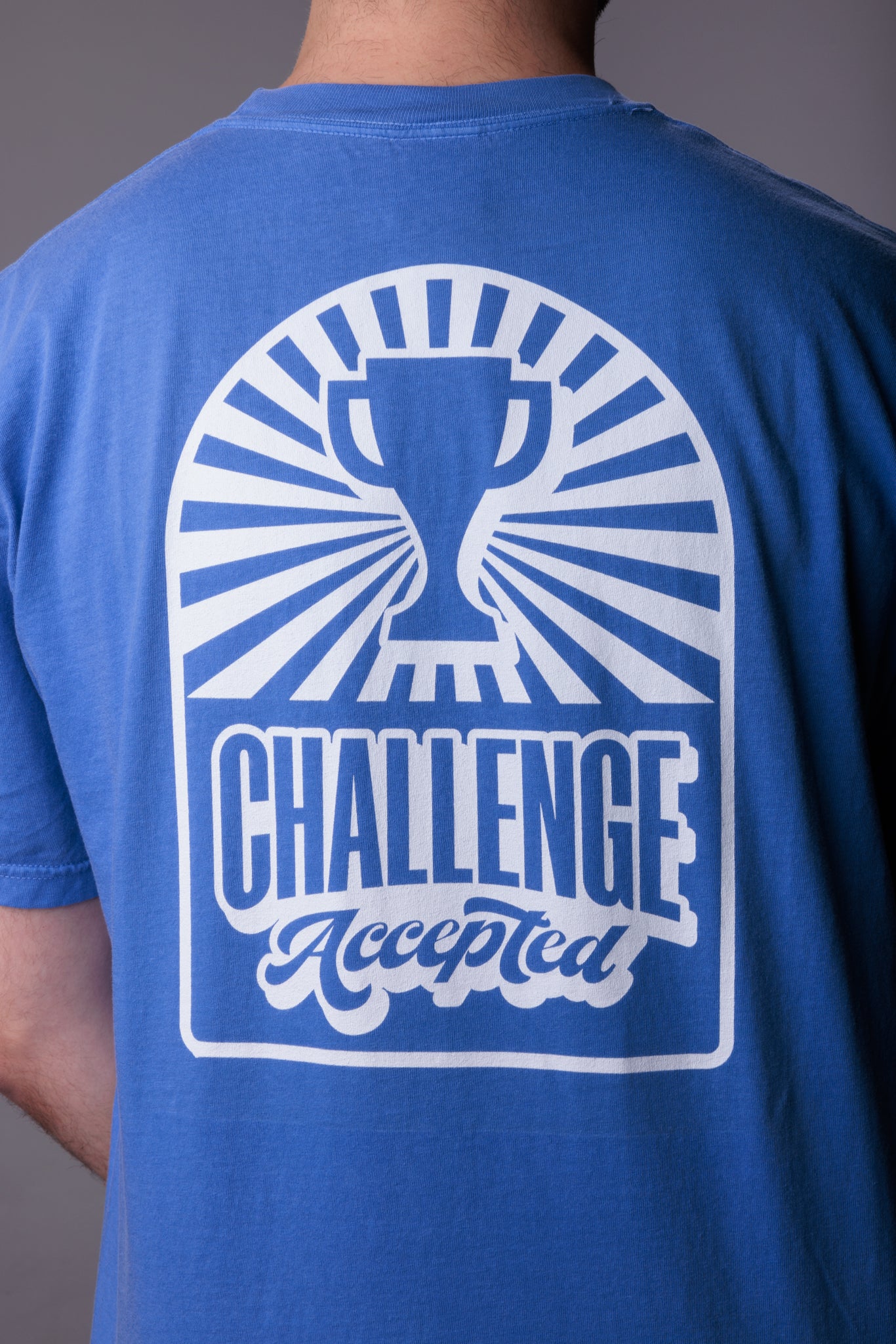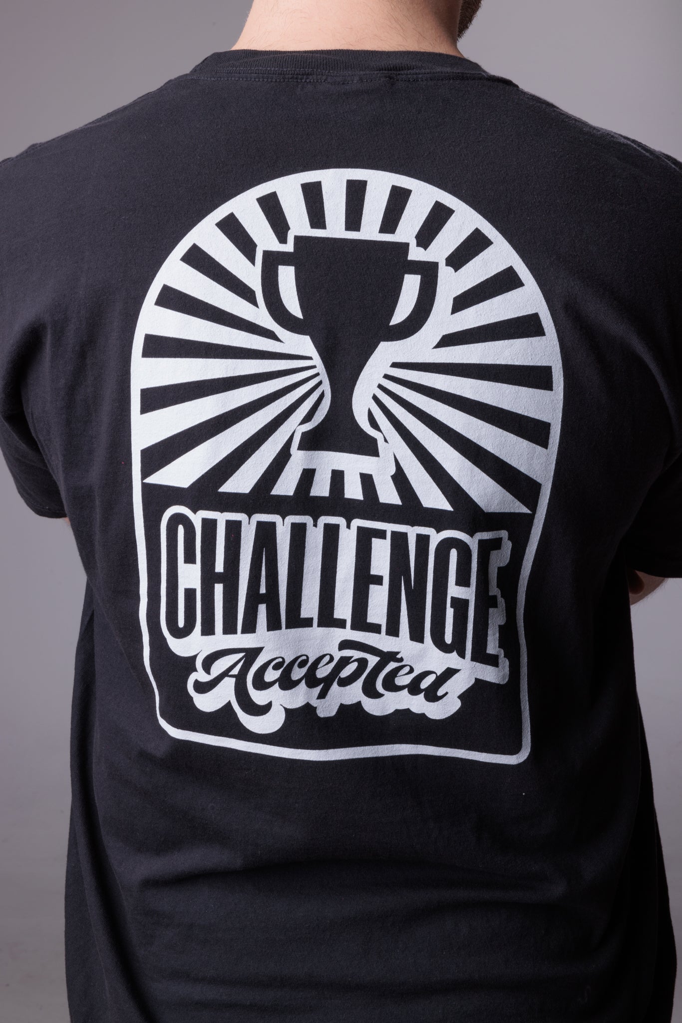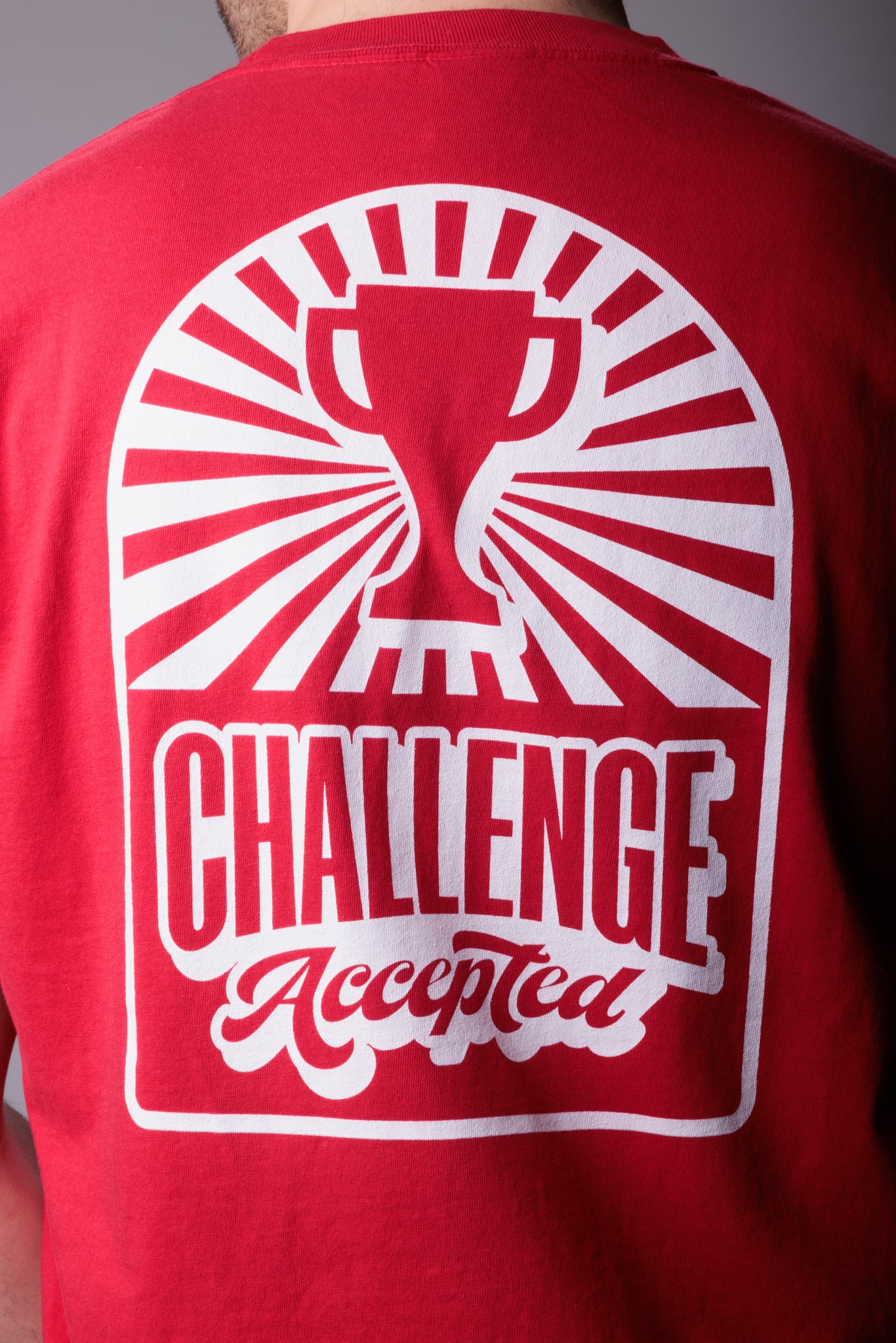 Choose from black, red, or blue base tee with our monochrome Challenge Accepted design printed in white. This is a unisex, garment-dyed heavyweight structured tee that’s also super soft and breathable. 100% ring-spun cotton.
